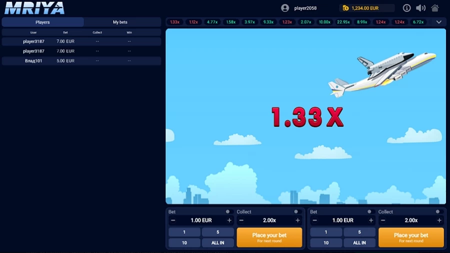 Простота – одно из основных преимуществ, которыми отличается игра Mriya на деньги. Оформлена она интересно. Гемблер видит ставки, сделанные другими пользователями. Также при желании можно изучить статистику. Это очень важно, если игрок планирует разработать собственную стратегию, просчитывая вероятность выпадения коэффициентов. Как и игра самолет на деньги, Mriya предлагает различные функции для упрощения процесса.